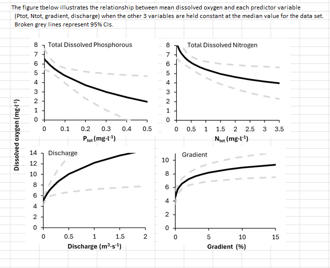 Mean DO = (50.50 · log10[(gradient+0.2)^0.05)] + (9.02 · log10(discharge+0.2)) + (-2.84 · log10(Ntot+0.1)) + (-5.84· log10(Ptot + 0.1)) + 6.63