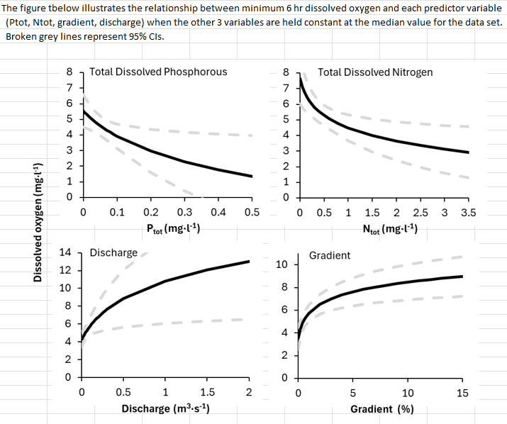 6 hr Minimum DO = (58.23 · log10[(gradient+0.2)^0.05)] + (8.4 · log10(discharge+0.2)) + (-3.03 · log10(Ntot+0.1)) + (-5.38· log10(Ptot + 0.1)) + 5.79