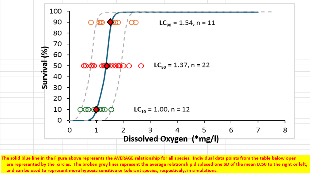 The survival function is assumed to follow a typical logistic curve through the mean LC50 for all fish species of 1.37 mg/l DO. Note that this is slightly higher than the geometric mean value of 1.26 reported by Saari et al. (2018), partly because of the additional data but also because we use a simple arithmetic mean; there was no meaningful difference between the median and mean values, indicating minimally skewed data so a geometric mean was not warranted. The standard deviation around the mean LC50 value of 1.37 mg/l was also used to calculate 95% CIs equivalent to a LC95 and and LC5 (95% CIs = 1.37 +- [SD * 1.96]) which were used in addition with the LC50, LC10, and LC90 to fit the modified logistic growth curve.